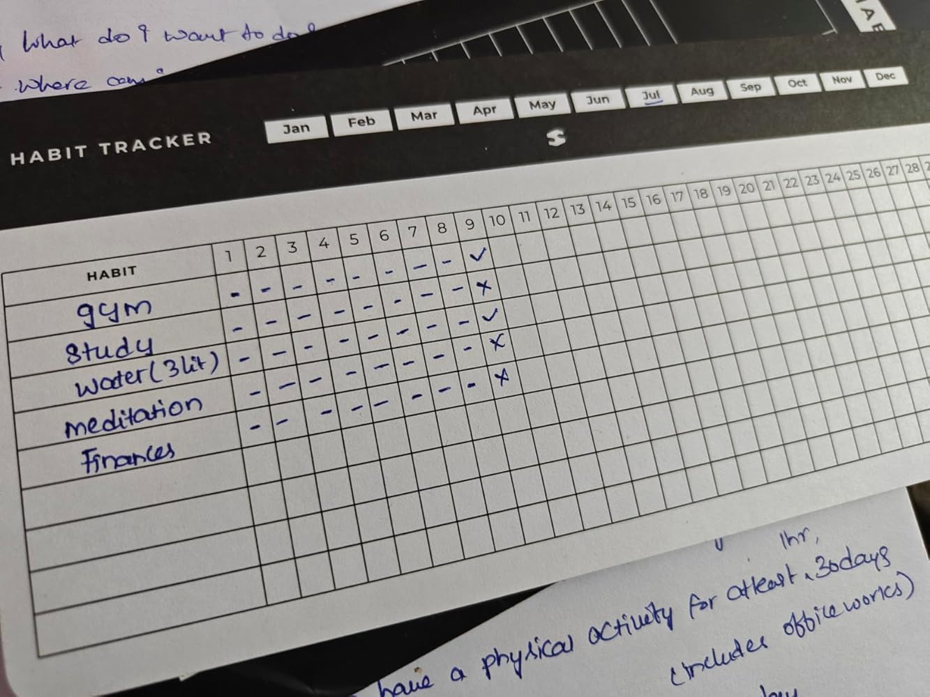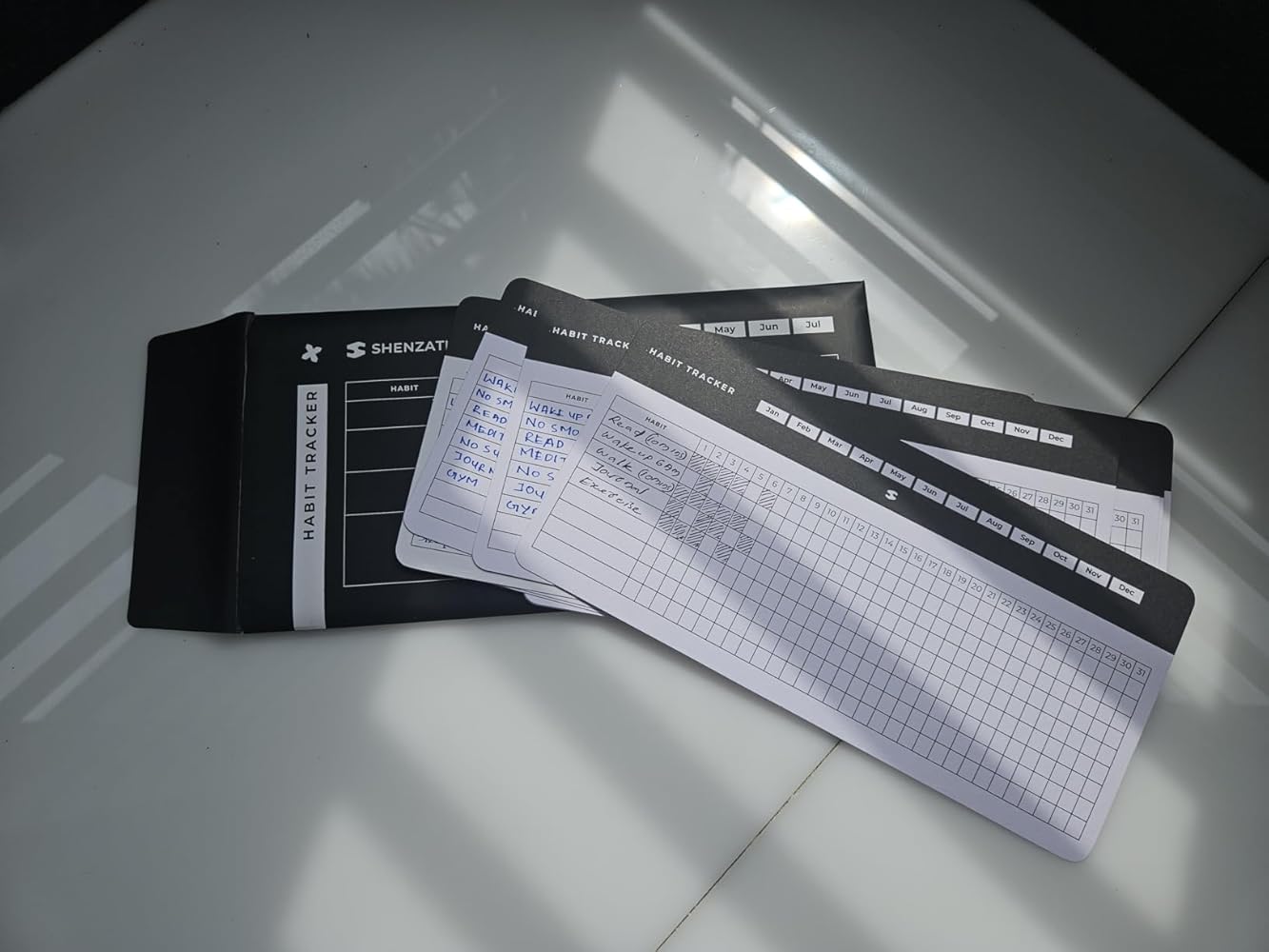 12 individual 31-day habit tracking cards in a single folder and you are good for an year, perfect for monthly habit-building.